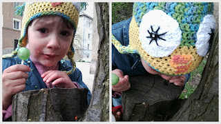 A tavaly elhagyott sapija egy baglyos volt, kb. 3* volt a fején... Szintén Lana Grossa fonalból ( ha jól emlékszem, akkor Basic Print volt). A képen nem a sapit, hanem a katicabogarat siratja, mert nem hozhatta haza. Tudom, zord anya...:)